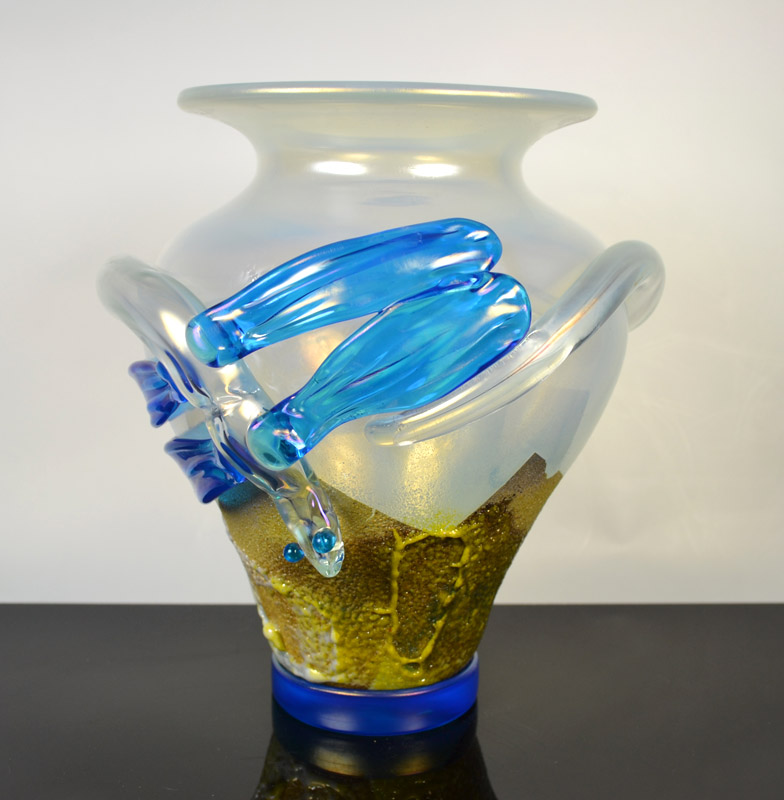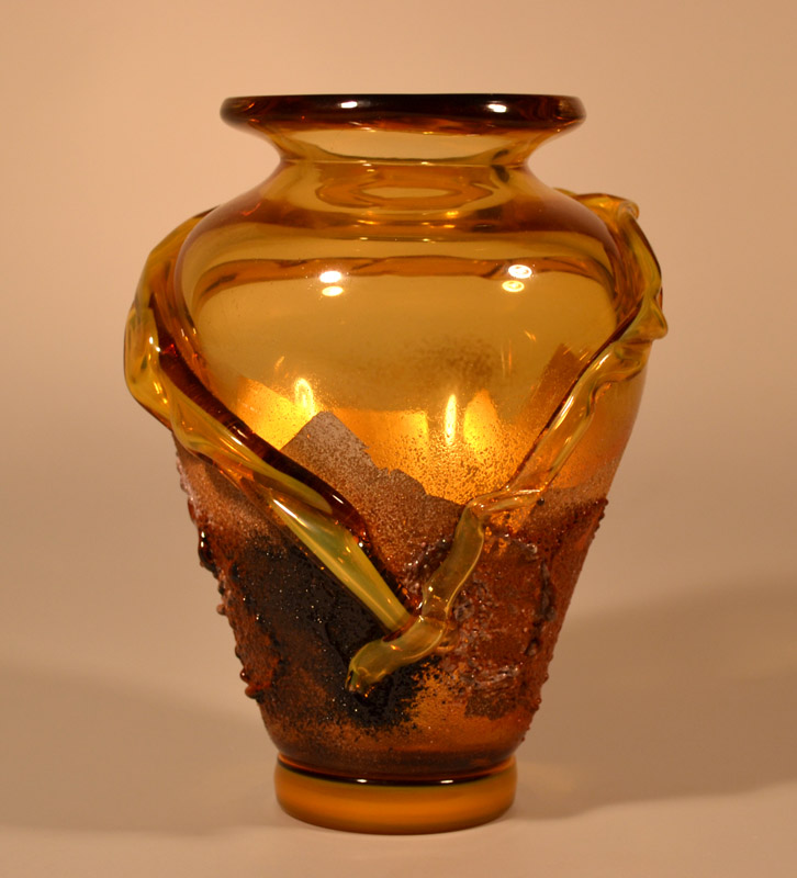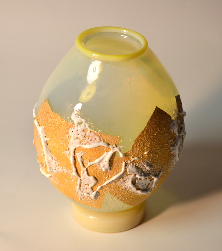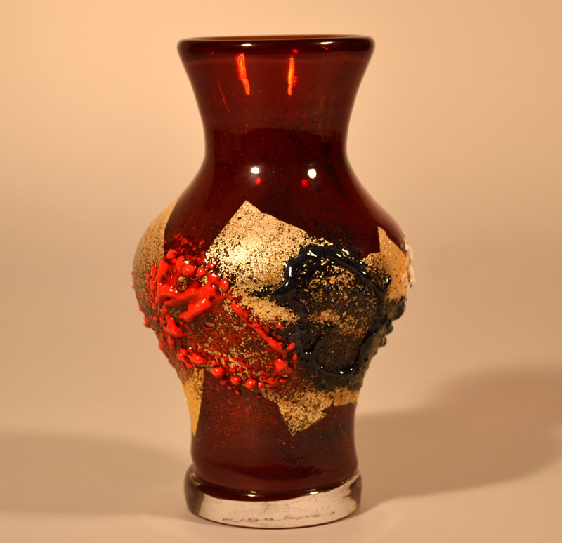 海外にいると自身のアイデンティティをとても意識する。イタリアの美しい色を用い、日本の伝統的な秘めた美しさを表現したいと思い独自の技法をあみだした。粒子の細かいガラスの粉を大量に吹きつけ、抽象絵画的な作品が出来上がった。